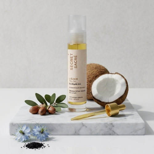 Douceur Pure est un shampoing 100% d’origine naturelle qui laisse le cheveux doux et brillant après le rinçage. L’élixir authentique est un soin complet cheveux et cuir chevelu à la nigelle. Découvrez les soins pour les cheveux à la nigelle de secret sacré, la 1ère marque de Haute Cosmétique Bio dédiée à la nigelle.